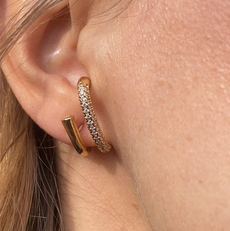 Raffinati e luminosi, gli Orecchini Doppia Fascia in ottone placcato oro uniscono design moderno e fascino senza tempo. La fascia impreziosita da zirconi si aggancia delicatamente all’orecchio, mentre la fascia liscia e lucida completa la forma con equilibrio e brillantezza. L’effetto a doppio cerchio crea un gioco di luce sofisticato e armonioso, ideale per esaltare i lineamenti con eleganza. Leggeri e confortevoli, sono perfetti per aggiungere un tocco chic ai look quotidiani o per impreziosire gli outfit più raffinati.