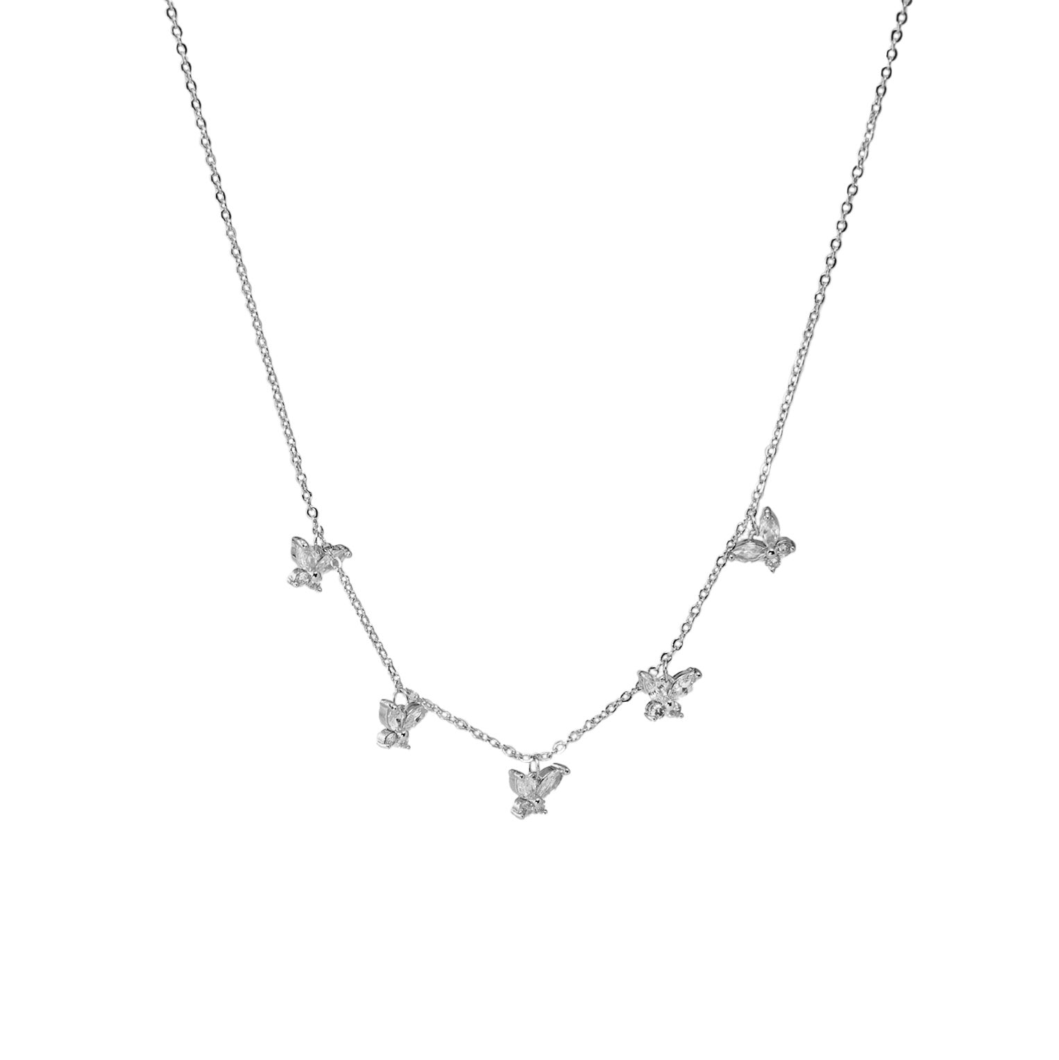 Embrace the beauty of transformation and grace with the Butterfly Kiss Necklace. This refined piece features a thin chain embellished with five delicate butterfly charms, a symbol of freedom, lightness, and new beginnings. Available in gold and silver tones, this necklace is perfect for completing any look, from everyday elegance to special occasions.