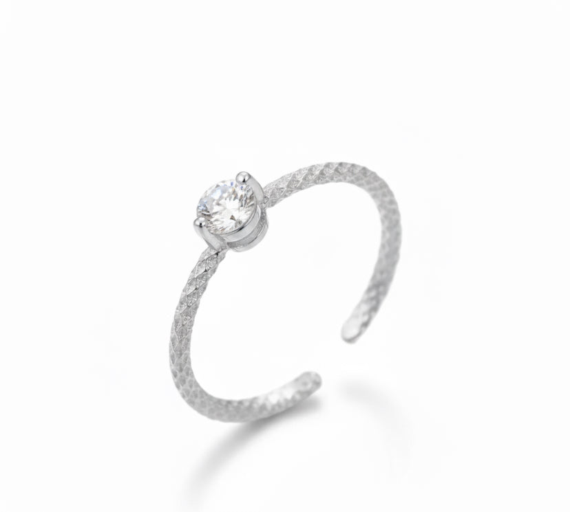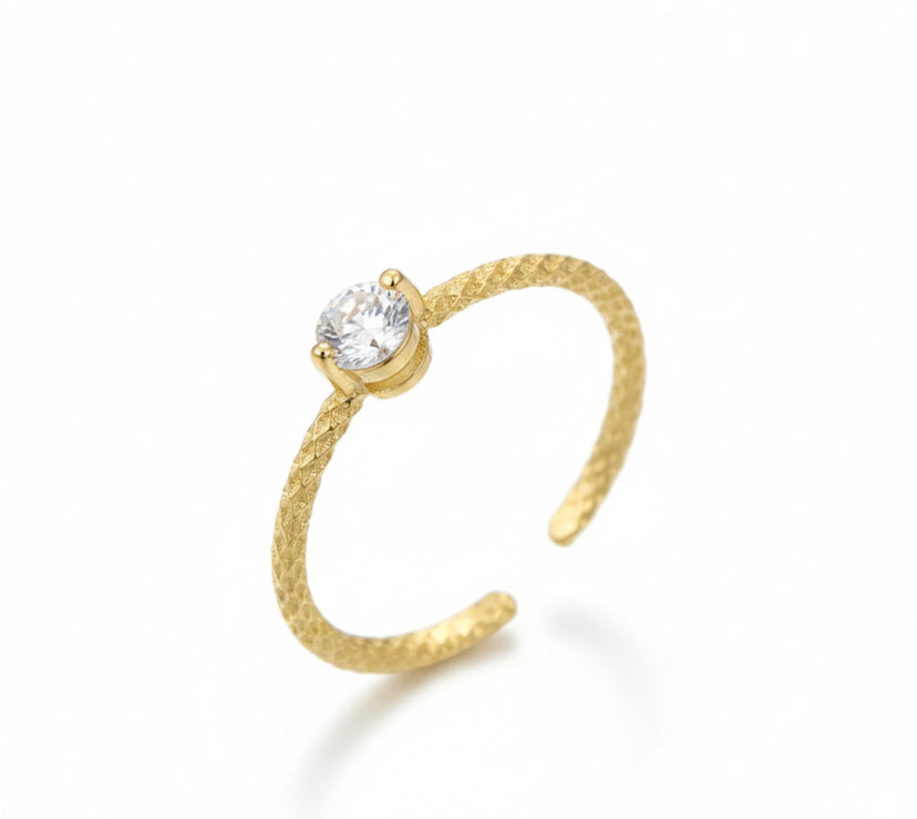 A refined ring with a brilliant zirconia, perfect for an elegant and delicate look. Available in two colors—silver and gold—to suit every style and occasion. The minimalist design is embellished with a sparkling stone, adding a touch of light to the hand. Thanks to its adjustable size, it comfortably fits different finger sizes, making it a versatile accessory.