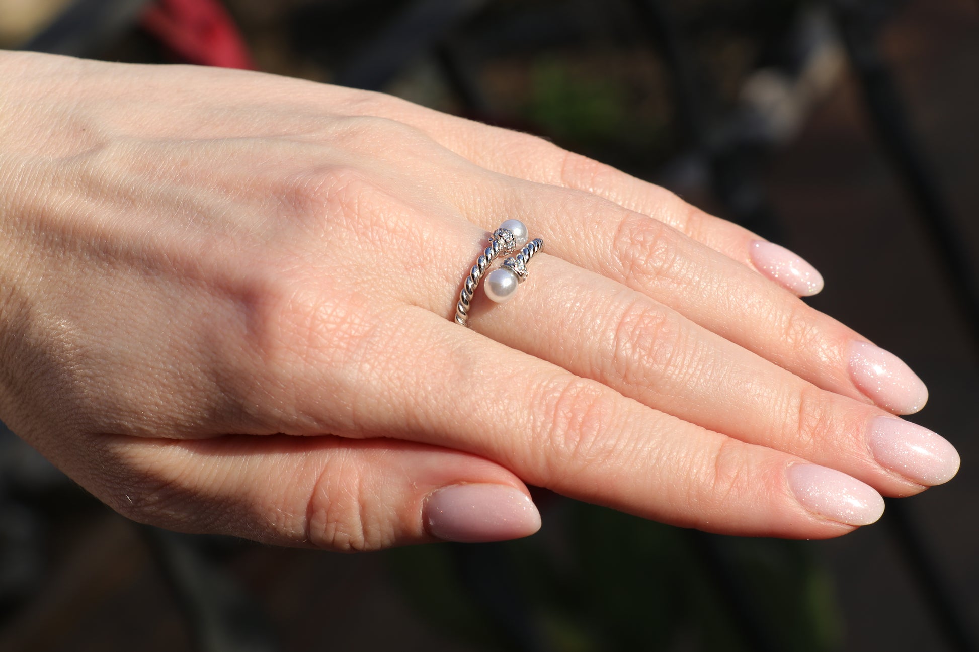 This adjustable, open ring features a delicate pearl accent, offering a timeless and elegant look. The twist design adds a unique touch, making it perfect for both casual and formal occasions.