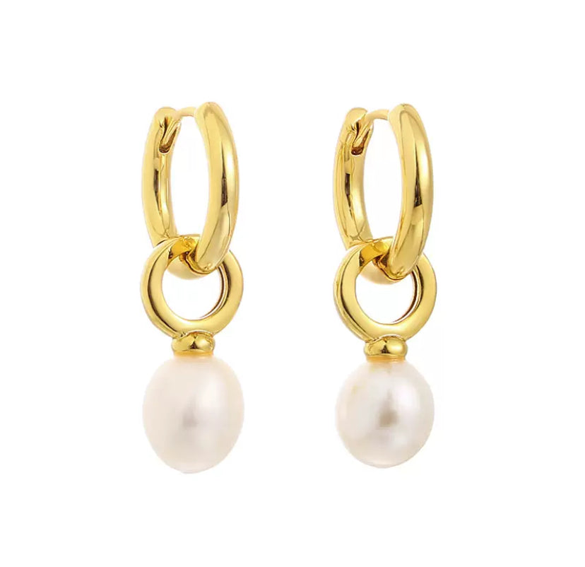 Elegant and refined, the Dainty Pearl Earrings feature a delicate gold hoop embellished with a dangling freshwater pearl. Crafted from gold-plated brass, they offer a sophisticated and timeless design, perfect for any occasion.