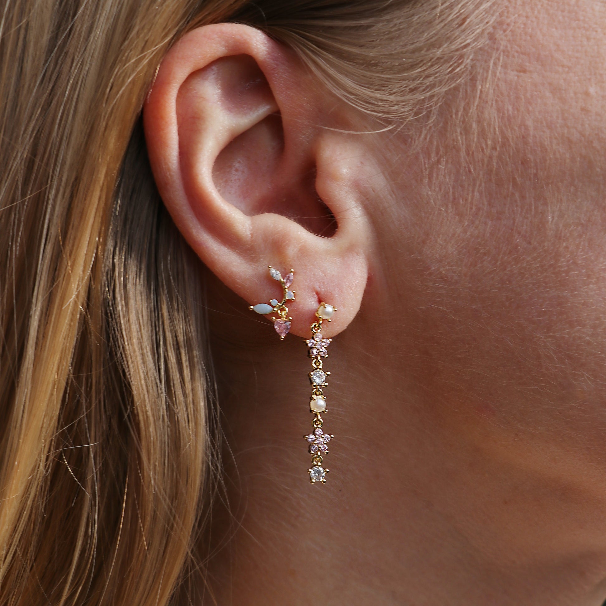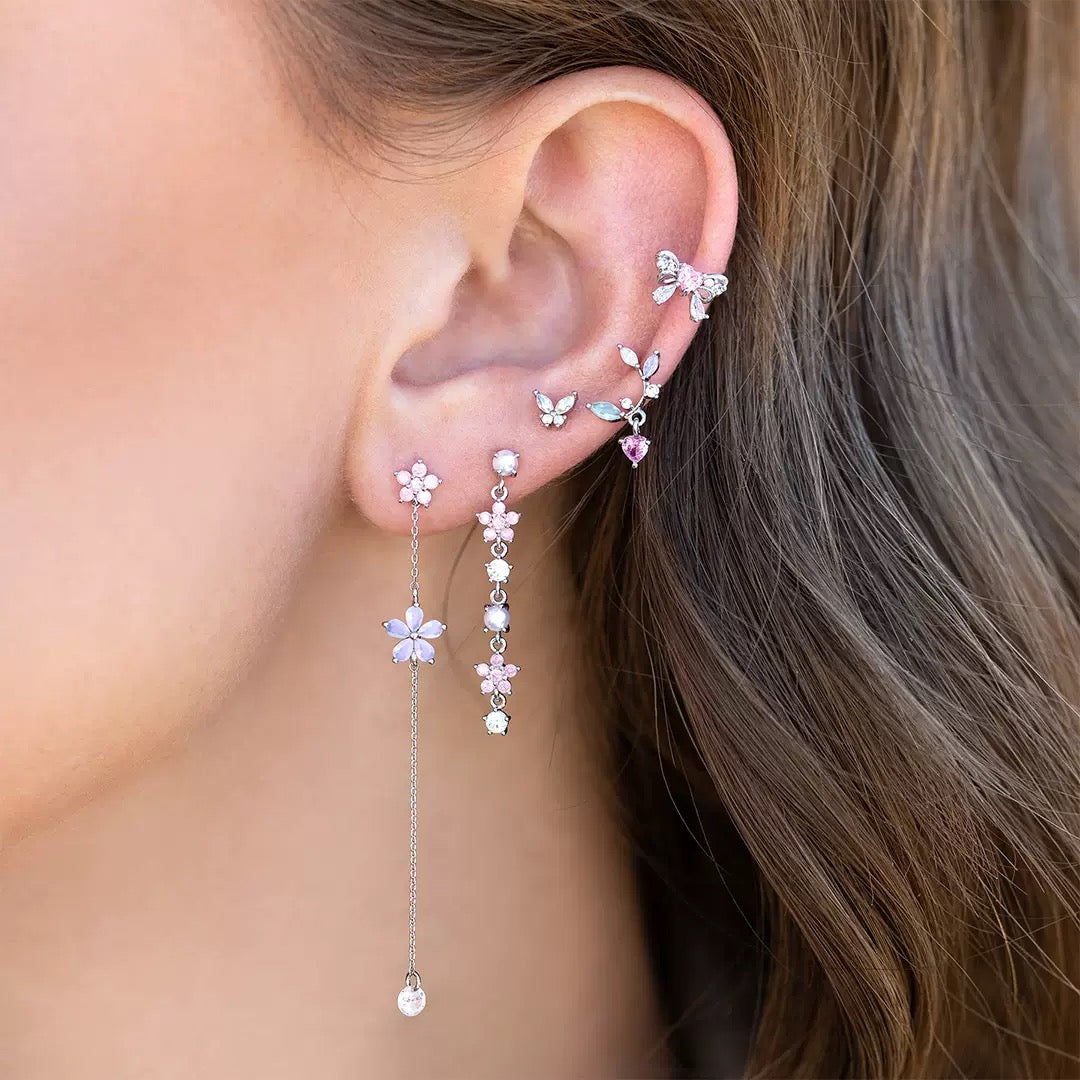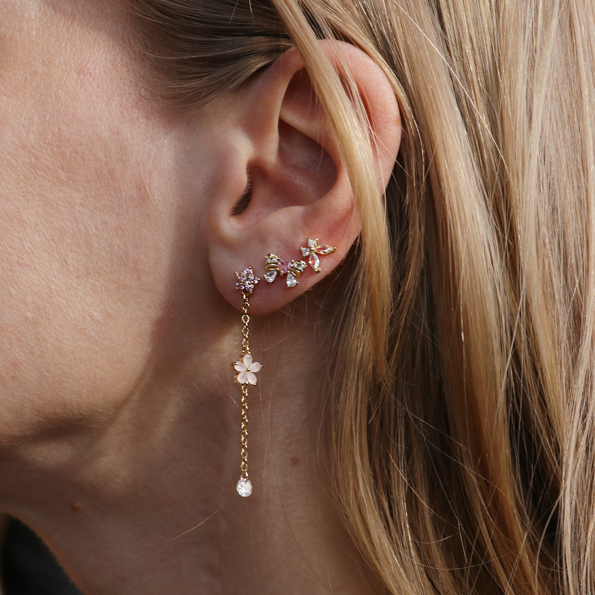 Il Set di Orecchini Petal Shine in ottone placcato oro celebra la grazia e la luminosità dei fiori primaverili. Le delicate forme floreali si intrecciano con cristalli dalle sfumature rosa, opale e bianco, creando un equilibrio perfetto tra romanticismo ed eleganza. Ogni orecchino è impreziosito da zirconi e dettagli scintillanti che catturano la luce con dolcezza. Il set comprende cinque orecchini diversi, pensati per essere indossati insieme o abbinati liberamente, ideali per look asimmetrici o per chi ha più fori. Un tocco raffinato e luminoso, perfetto per completare qualsiasi outfit con eleganza naturale. Il prezzo include un set di 5 orecchini.