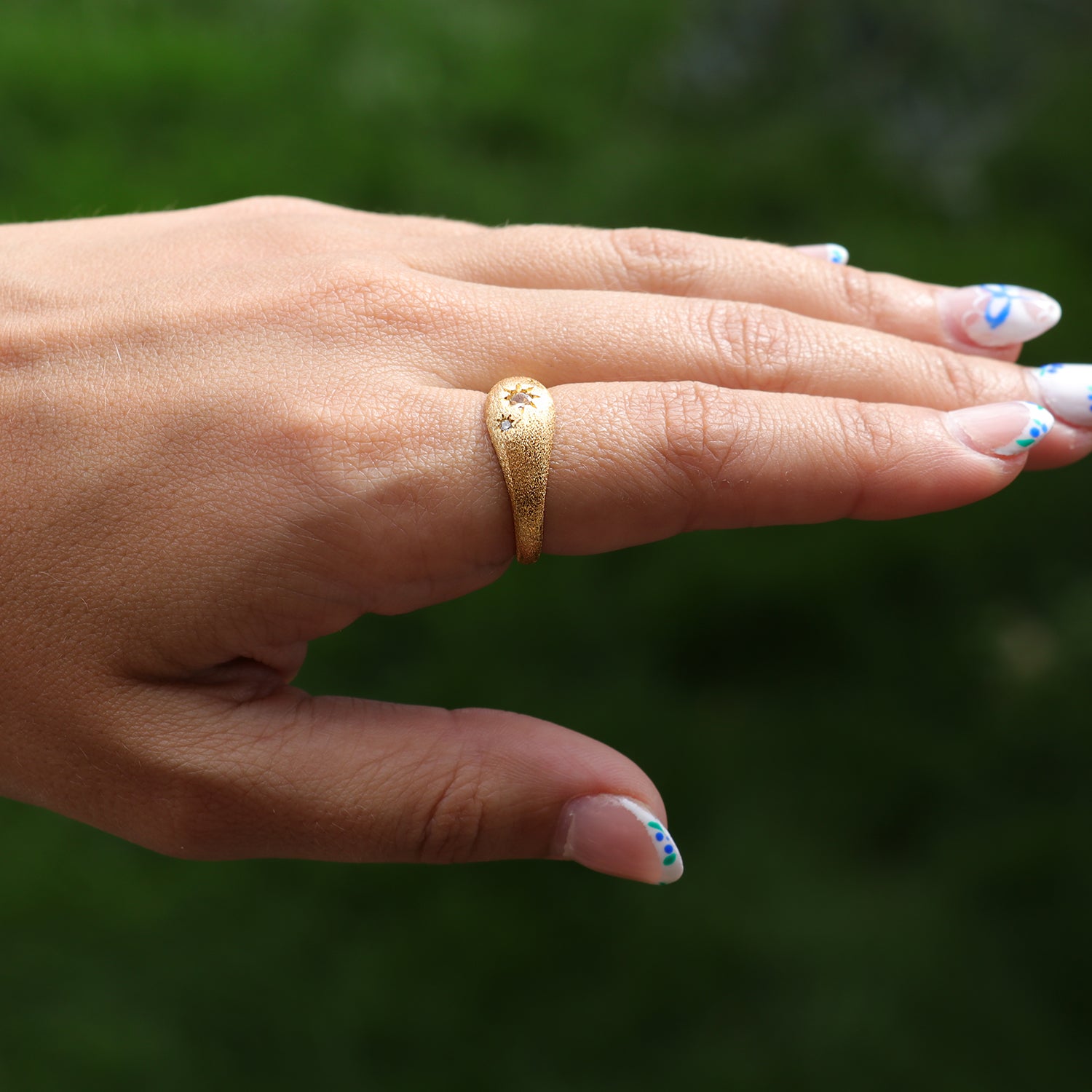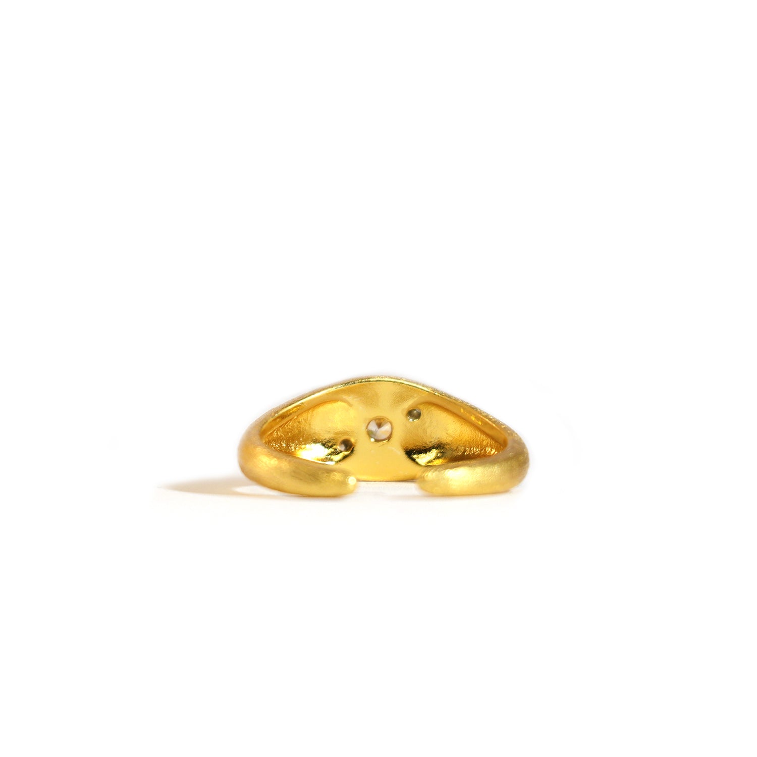 Soleflare è un raffinato anello regolabile in ottone placcato oro, impreziosito da tre zirconi incastonati che catturano e riflettono la luce come piccoli raggi di sole.