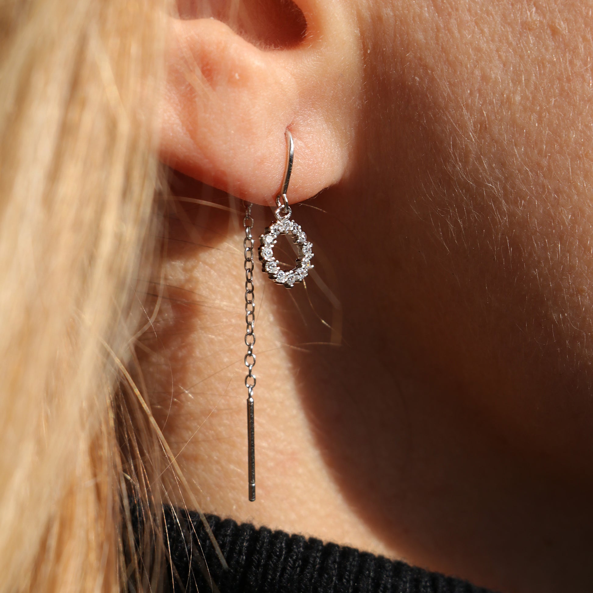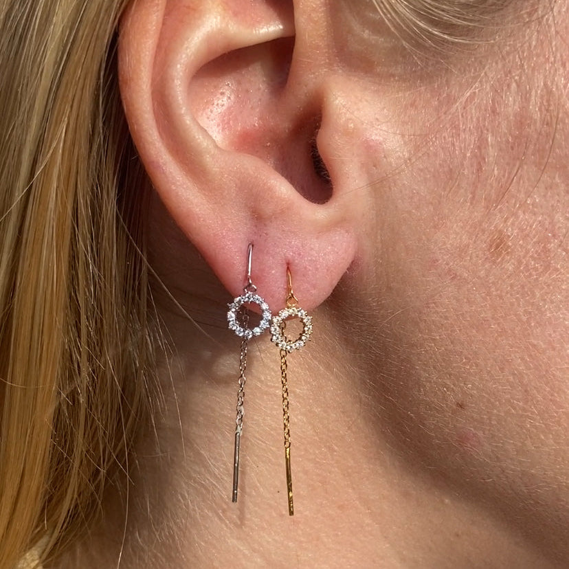 Un design raffinato che unisce leggerezza e luminosità. Gli Orecchini Solenne sono realizzati in Argento Sterling 925 e proposti in due preziose finiture: placcatura in oro giallo e placcatura in oro bianco. La catena sottile scivola delicatamente, terminando in un elegante cerchio impreziosito da zirconi scintillanti che catturano la luce ad ogni movimento. Dotati di un gancio che si fissa comodamente all’orecchio, restano stabili e armoniosi, donando un tocco di grazia e luminosità ad ogni look. Perfetti per chi ama uno stile elegante e senza tempo.