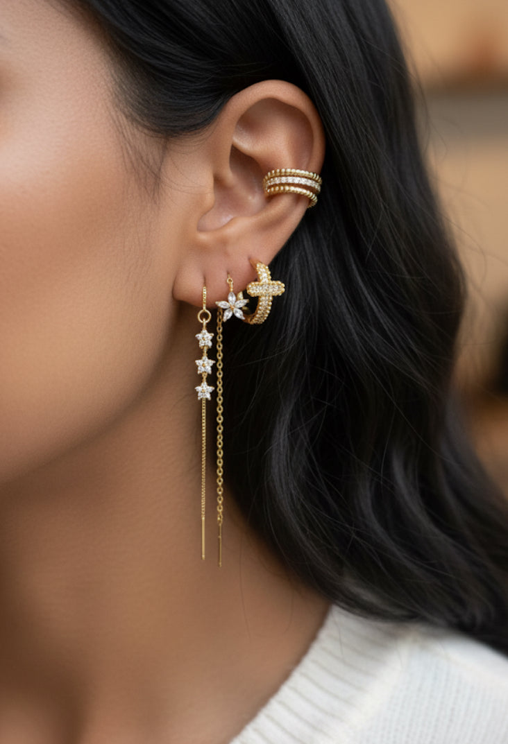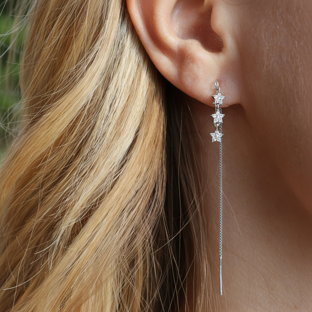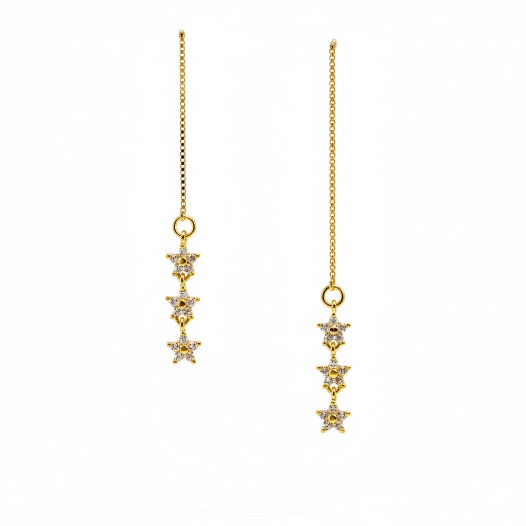 Brighten up your look with these refined drop earrings featuring three sparkling stars. Available in gold and silver tones, their elegant, fluid design creates a luminous and sophisticated effect, perfect for adding a touch of magic and femininity to any outfit.