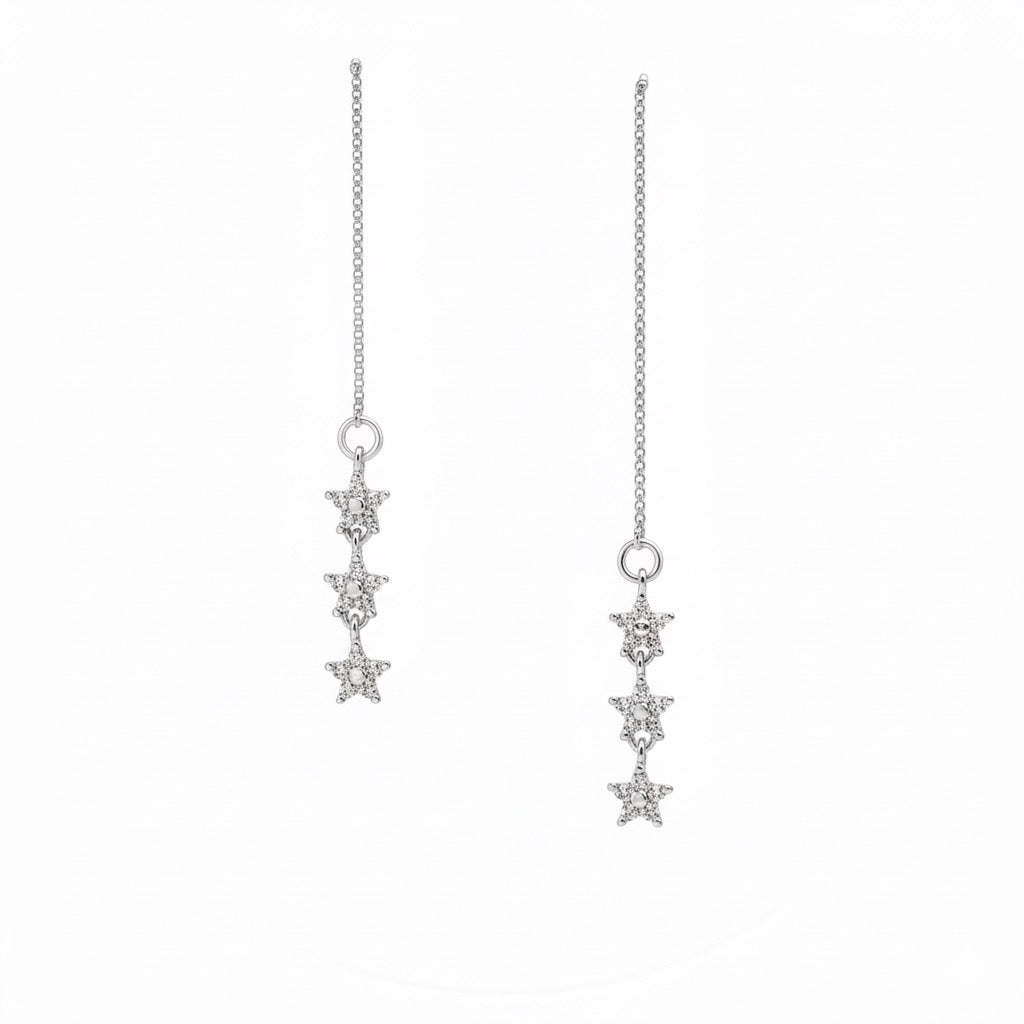 Brighten up your look with these refined drop earrings featuring three sparkling stars. Available in gold and silver tones, their elegant, fluid design creates a luminous and sophisticated effect, perfect for adding a touch of magic and femininity to any outfit.